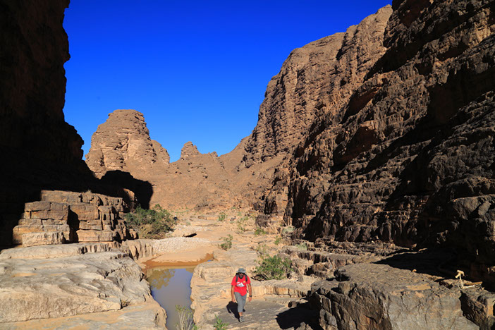 I invite you to participate in this adventure in Tassil N'Ajjer and Tadrart around Djanet. I have already traveled 3 times and explored many canyons in this region, in 2009, 2010 and 2018. This trip will be first of all a human adventure with the help of our Touareg friends who will guide us through their fantastic and immense desert territory. They will let us participate in their nomadic life and discover the country in the truest way. This journey will give us intense and sincere human encounters, aesthetic moments and great joy. We will also have the opportunity to discover and explore new gorges. Our adventure begins in Djanet (1000 m altitude) which can be reached by plane. This city is located in the southeast of Algeria, 1500 km from the capital, and is the capital of the Touareg N'Ajjer.