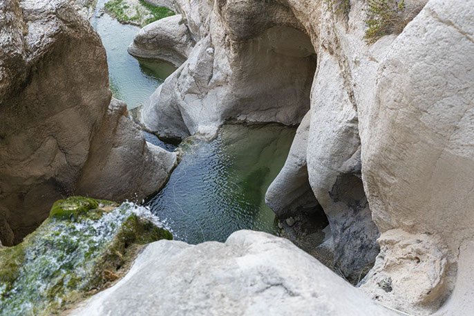 Il flusso d'acqua è piccolo, in quanto il clima è desertico, ma i colori dell'acqua e delle rocce sono unici. Vasche con acqua color smeraldo circondate da pareti di bianco e puro calcare, dove potremo godere di sorgenti calde e scoprire gli abitanti e la cultura locale. Il programma prevede anche una grande traversata speleologica.